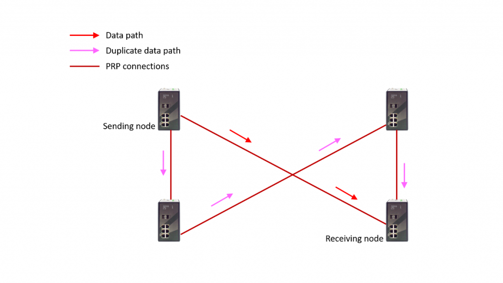 Parallel Redundancy Protocol (PRP; IEC 62439-3 Clause 4) is another redundancy protocol used in power grid communications. It also creates a redundant network topology, but instead of rings, it uses a double star topology to send duplicate data packets over two independent network paths.